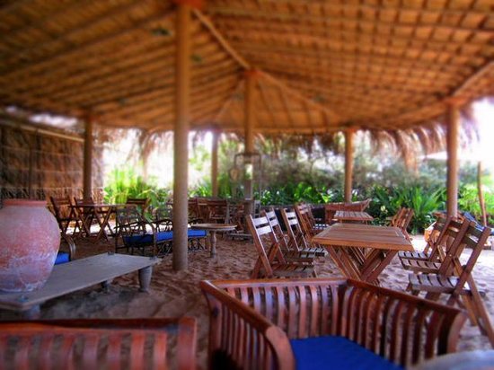 Open-air eatery at a small hotel serving seafood-centric dishes in a rustic, beachfront setting.